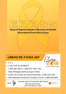 Si usted o alguien que conoce está considerando el suicidio, llame de inmediato a la Lı́nea PAS de ASSMCA, 24 horas al dı́a, los 7 dı́as de la semana al: 1-800-981-0023 / 1-888-672- 7622 TDD. Para más información puede comunicarse con la extención 2755 o con la Comisión para la Prevención del Suicidio del Departamento de Salud escribiendo a: prevencionsuicidio@salud.pr.gov.