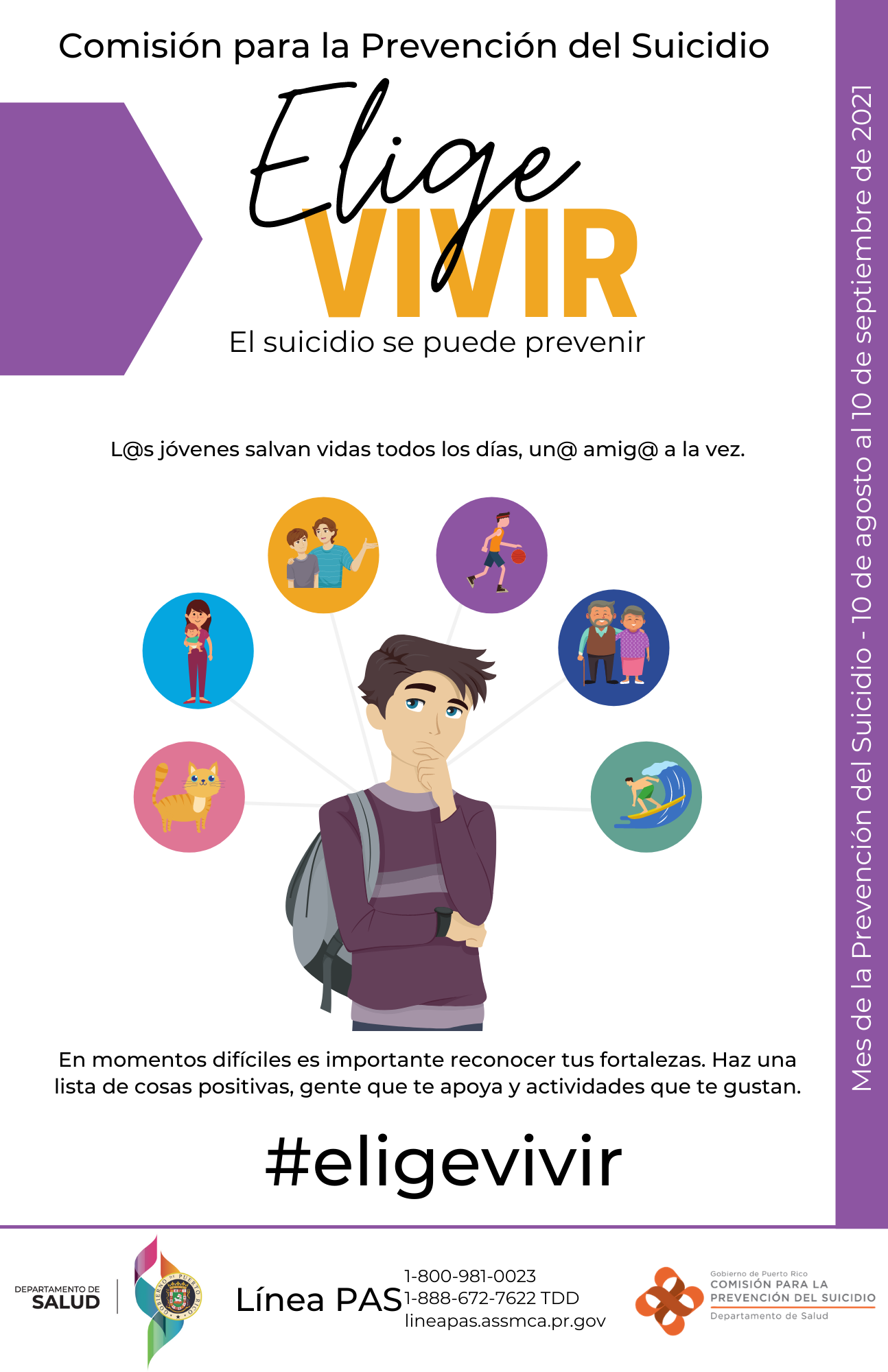 Si usted o alguien que conoce está considerando el suicidio, llame de inmediato a la Lı́nea PAS de ASSMCA, 24 horas al dı́a, los 7 dı́as de la semana al: 1-800-981-0023 / 1-888-672- 7622 TDD. Para más información puede comunicarse con la extención 2755 o con la Comisión para la Prevención del Suicidio del Departamento de Salud escribiendo a: prevencionsuicidio@salud.pr.gov.