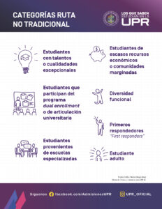 Debe completar la solicitud de admisión en la fecha establecida. Deberá marcar la opción de Admisión No Tradicional e indicar la categoría bajo la cual solicita CATEGORÍAS enlace a las categorías. En la solicitud de admisión en línea encontrará un enlace para que incluya evidencia de acuerdo a la categoría que solicita. Será evaluado por un comité y se le podrá solicitar un examen de ubicación, portafolio, ensayo, carta de recomendación, entre otros.