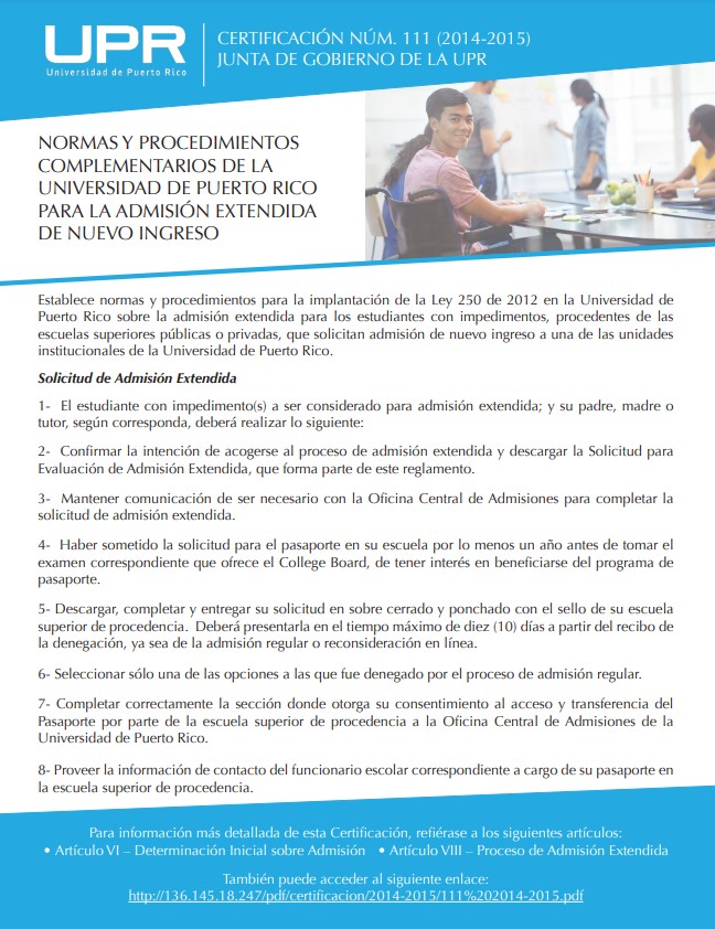 La Universidad de Puerto Rico establece normas y procedimientos para la admisión extendida de estudiantes con impedimentos, en cumplimiento con la Ley 250 de 2012, según enmendada. Los solicitantes deben haber solicitado primero la admisión regular y, si son denegados, pueden optar por este proceso. Para ello, deben completar una Solicitud de Evaluación Extendida, autorizar la transferencia de los documentos pertinentes y entregar la solicitud en un plazo de diez (10) días tras la denegación. Solo pueden seleccionar una de las opciones previamente rechazadas en la admisión regular. Además, deben incluir evidencia médica actualizada para validar su condición y garantizar su elegibilidad.